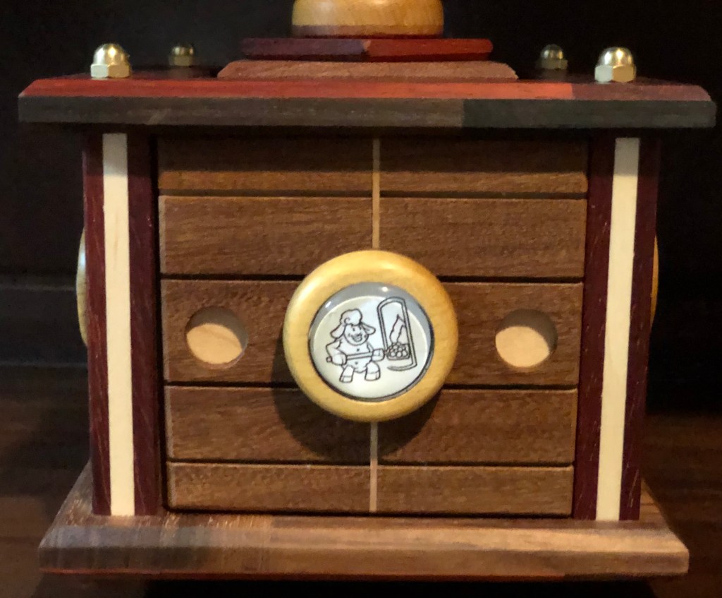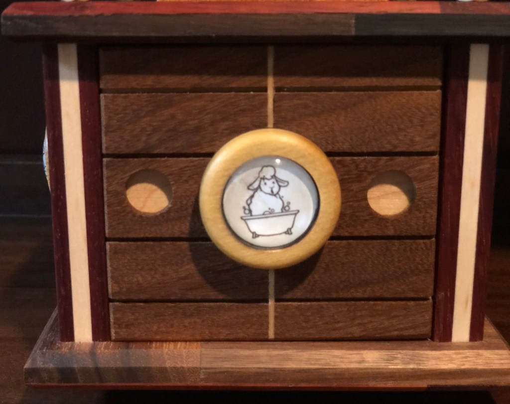 EWE is a cube made of a variety of woods that seems to float a few cm above whatever surface it is on, due to the placement of the escape hatch on the bottom. All four sides are identical, except for a little acrylic portholes giving us a view of the sheep crew as they cook pizza, take a bath, extinguish a fire, and look back at us with X-Ray glasses; all except for Wee Fae, desperately reaching up to us as we look down the fifth porthole on top of the ship. Our goal: “Be the noble hero and join the quest to remove Wee Fae from the top of the craft. She just wants to go home before the others resume their zoom into space.”