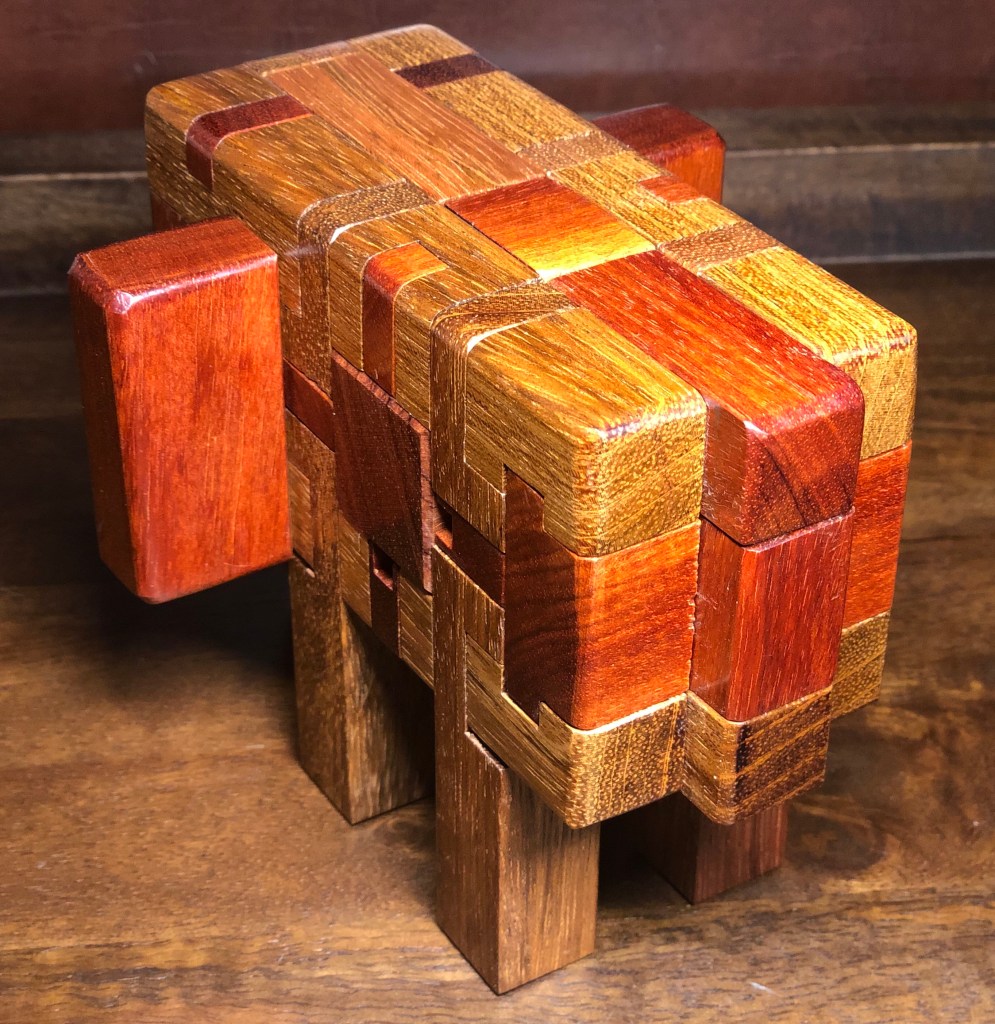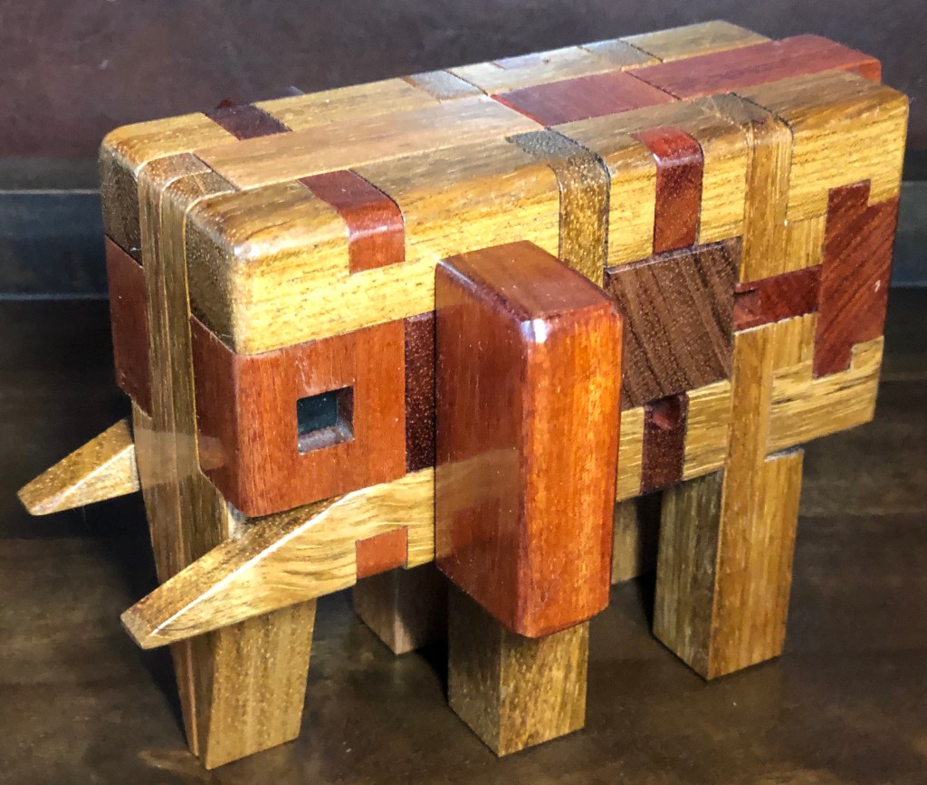I am clearly a fan of Jerry’s work – I have pieces he made for Bill Cutler that show his skills as a craftsman, and his own designs blow me away. Burrlephant 3 is another example of Jerry’s ingenuity as a puzzle designer, with multiple trick phases belying its playful exterior. First off, it is important to distinguish this from Don Closterman’s Elephant puzzle; I’ve not done that puzzle, but it appears to be a kumiki-like 3D assembly, and, as such, is nothing like Burrlephant in anything other than a cursory look at its appearance. Closterman’s Elephant could be an amazing puzzle, I’ve no idea, but I am mostly sure that it does not contain the mechanics of Jerry’s that separates his puzzles from most interlocking burrs.