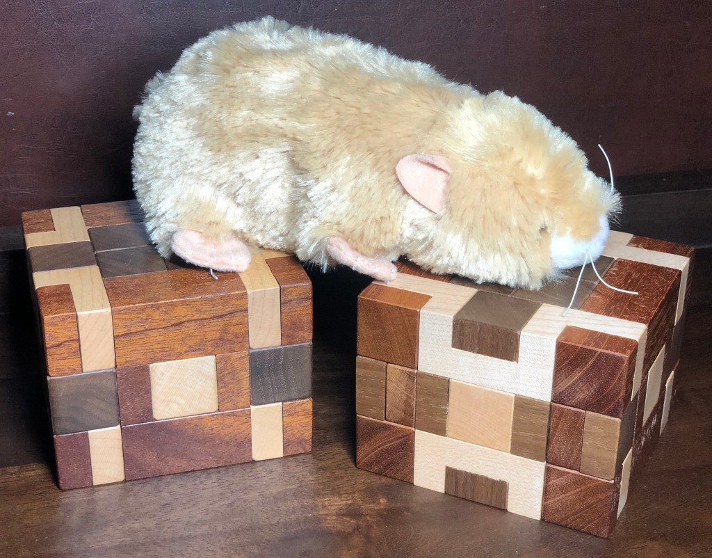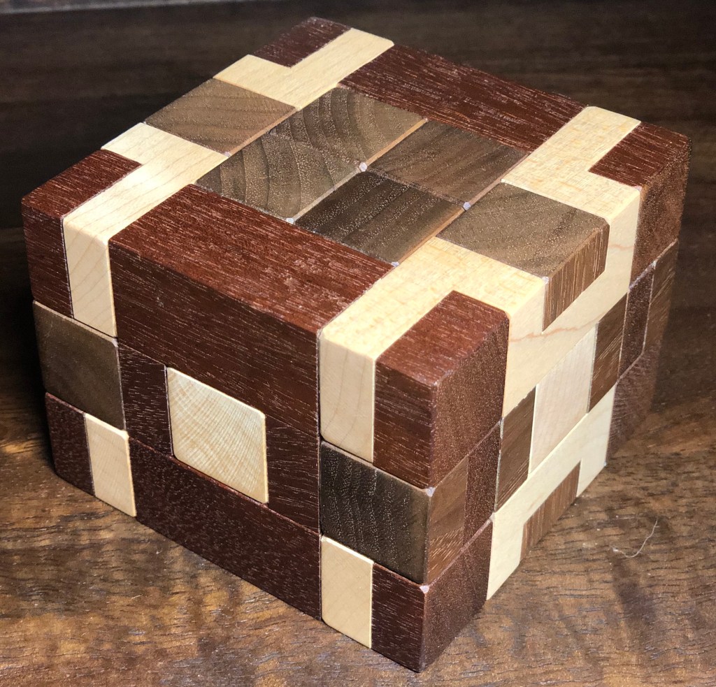 I found this puzzle to be an excellent interlocking burr cube (squashed or otherwise) – the addition of a “trick” locking mechanism making it especially fun. I hope to eventually collect Quadlocks III and IV (II was essentially a 23-piece version of I, and very few copies were made, so my completist urges are that much more likely to go unfulfilled).