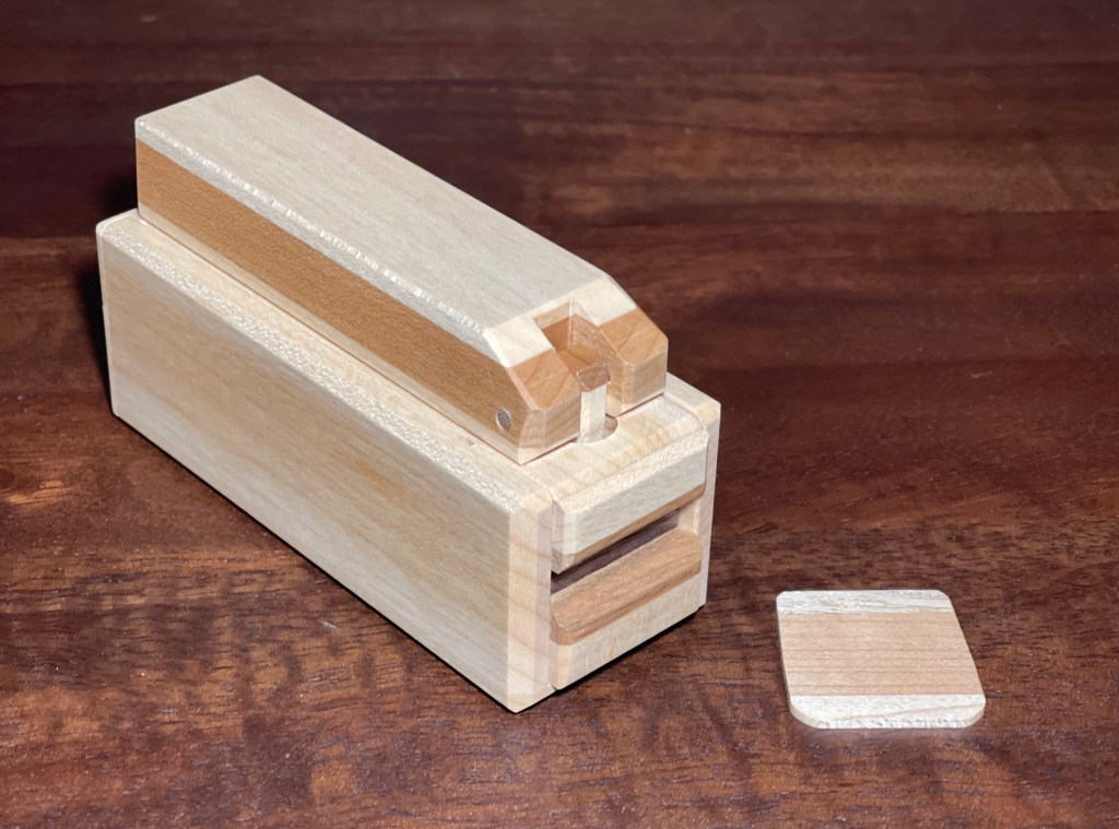 Kamei’s box resembles a classic safe (3.5″ x 3″ x 4.5″): four tiny legs beneath an upright, rectangle, complete with notched dial that seems to spin freely. Picking it up, you can hear one or more somethings moving around inside. Kamei’s hanko is on the back of the box; it is pretty clear when you have solved the box and seeing the hanko on its outside helps to confirm that you are not missing anything once it is open. Finding the right approach took a bit of creative cat burgling – of all the boxes, this is the one that gave me the most trouble. I was pretty sure I knew what to do at the outset, at least to some extent, and while it turned out to be correct, executing it still takes a bit of focus. I’ve heard from other puzzles who are similarly confounded by how specifically it works, in some ways feeling similar to other boxes of Kamei’s that rely on mechanisms that make little sense, until they make total sense – while you may yet continue to struggle to understand how the concept is realized, you can at least understand what is happening. Of this year’s boxes, this is the one whose internal layout most confounds me.