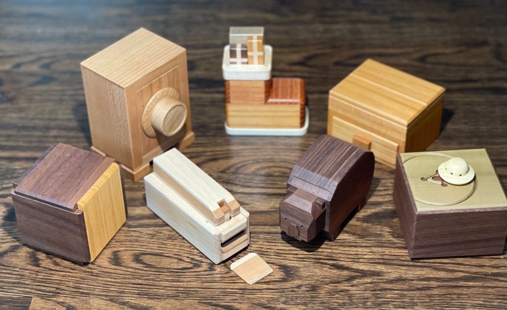 Over the course of the last year, I added more and more of the craftspeople at the KCG until I was on the list for 7 of the 8 boxes (sorry Fumio, I really did mean to add yours as well……). As in the past, I chose to resist the temptation of opening the boxes upon arrival, opting instead to hold out for Christmas morning. My mother-in-law always gets a kick out of seeing them, and it is one of the rare times when I can get my teenage son to look at something I like for a moment or two. Most importantly, the anticipation is fun and this year’s boxes did not disappoint! As is to be expected, all puzzles reflect the brilliant standards of Karakuri puzzles, working smoothly and looking even more striking upon close examination.