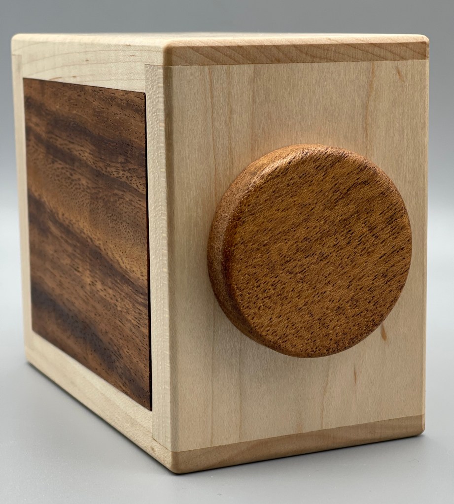 TNB has contrasting woods similar to Spirit Box, with a maple body, sapele knobs, and a lovely monkeypod top (the final box may well use different woods). Sized at 6″ x 3″ x 4″, it fits nicely among the majority of Dee’s boxes. The pair of knobs on the narrow sidesh makes me wonder if Dee will next design a box with a single knob, giving the series (not a series) a nice balance (i.e. Portal = 4, Space = 3, TNB = 2, Non-existent Box = 1).