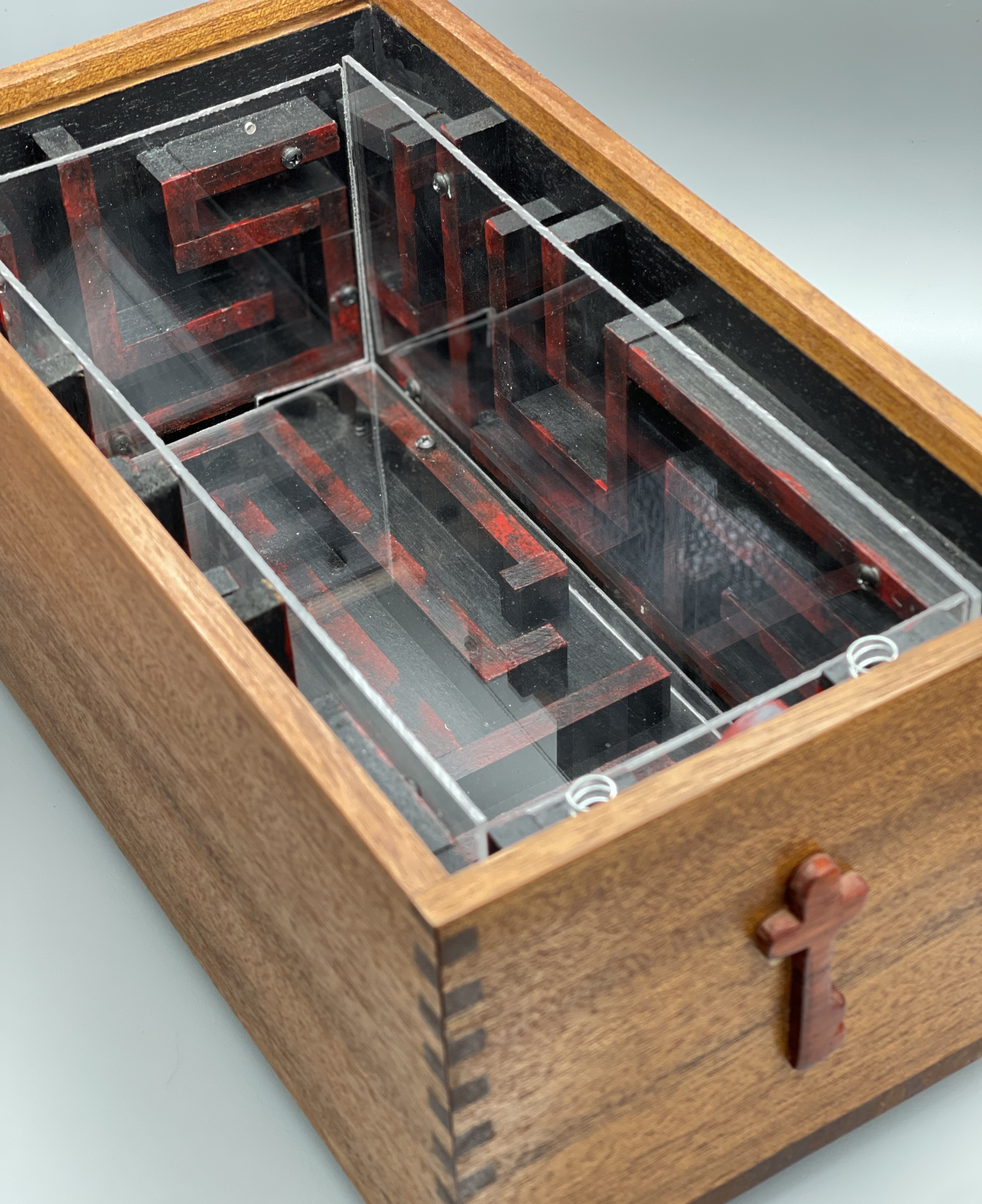 I told Dee that I think it could make for a pretty fun series for the maze-lovers of the puzzling world: he could add traps, dead ends, maybe windows and some dynamic tricks, etc… basically turn it into something like a wooden revobox, which kinda sounds cool. Blind mazes aren’t everyone’s cup of tea, but opening it was a fun challenge and the red-topped, black maze under the clear acrylic was just neat. This was made before Dee really knew as much about puzzling in general, and I think it was maybe a bit of a proof of concept to see if he’d enjoy doing it – luckily for us he did, as it was just several more months of ideas and prototypes from there to Blinded II and WMH.