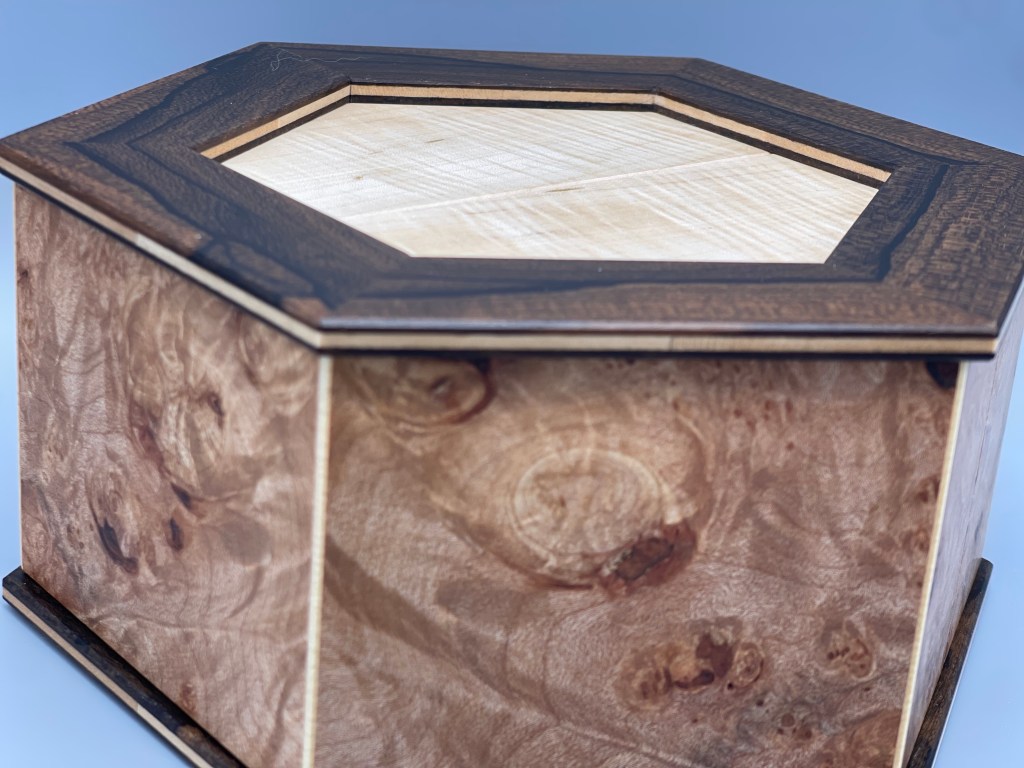 A few weeks later and an absolutely gorgeous box arrived: dark Ziricote contrasting with Pacific Maple Burl and Curly English Sycamore, the burl wood’s tones shifting between light brown and pink, and a slight trim to the lids that is a subtle nod to his skills. This is a box to drool over (as with many of his creations). Its size is similar to Plus Box, smaller than the Lotus/Caterpillar/Butterfly boxes; a perfect fit for two hands. The sides feel like butter and the box has an overall feel of solidity that helps with what comes next, for Kagen warns us that we “will need to take a leap of faith and overcome [our] worst fear about the box.”
