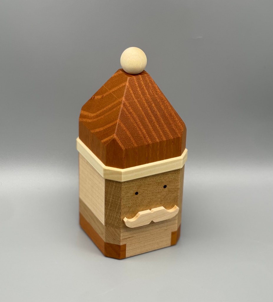 Sticking with the Christmas theme of the last three years, Kikuchi brings us Santa’s (beardless) head, somehow smiling merrily despite his unfortunate decapitation. The largest of this year’s boxes at 5.25″ x 2.25″, there is something rolling around inside to work with (or be distracted by). I found this to be somewhat tricky, making early progress before getting stuck going in circles, eventually discovering that logic would provide me with the aha! I needed to open it. A fun if a bit simple solve that keeps up with Kikuchi’s holiday tradition of Christmas-themed boxes.