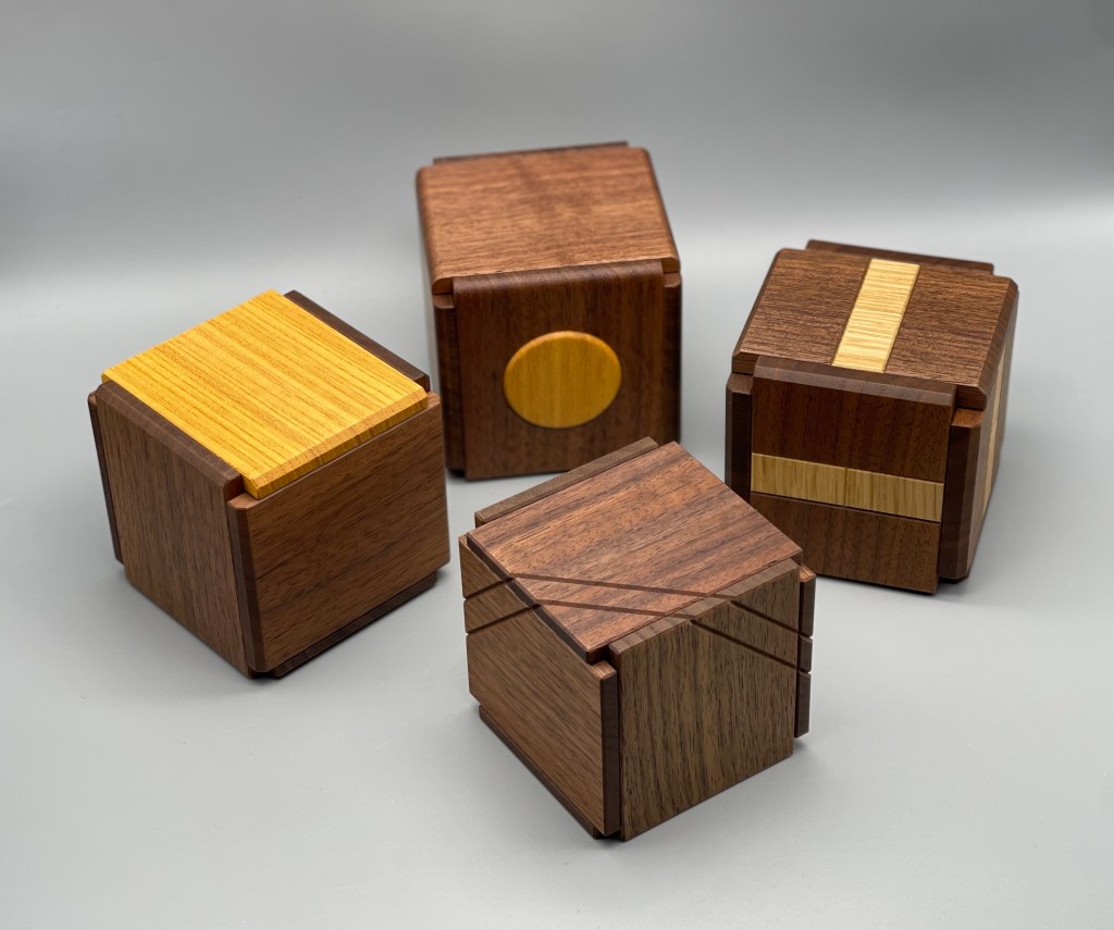 I was able to solve it without too much trouble (although by no means right away) but then spent even more time re-solving it for kicks. This is likely to join the ranks of boxes that I like to pick up and fiddle with as its solve is just so darn satisfying! The aesthetic is simple but nice, cute at a rather diminutive 2.25″. It’s aesthetic allows it to sit well alongside puzzles like the Fluctuation and Reversible Boxes from last year.