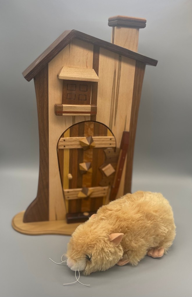 Puzzleduck Pastures is Kel’s “response” to Michael Toulouzas’ Fairy Door (and, in turn, precedes Tracy Clemons’ take: Dark Fairy Door). The puzzle looks like the facade of a playful, cartoonish home, the roof slightly askew, a bulbous door, sketched windows, and so on. The puzzle is a sizable 12″ tall and 8.5″ at its widest point on the base; at 3.5″ at its deepest, it evokes a sense of a theatrical facade from which one might expect Puck to dramatically emerge (“And those things do best please me, That befall prepost’rously.”)