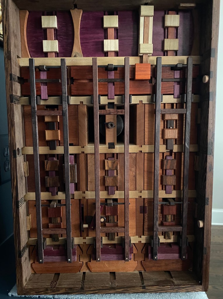 Once I had ooh-ed and aah-ed enough for the time being, I set about exploring. I had already determined that all drawers were locked, except for the circular one in the center, which opens freely (although perhaps not completely) as seen in the vid. This drawer is dark and cylindrical, with a number of squares running down its length, contrasting wood (purpleheart?) filling it partway, which can be seen as it rotates more or less freely. Other than that, no drawers will open, but many do feel unique; some have more give than others, or there may be other differences you can sense with just a bit of a tug on the handle.