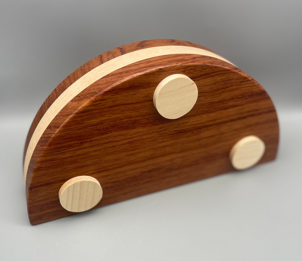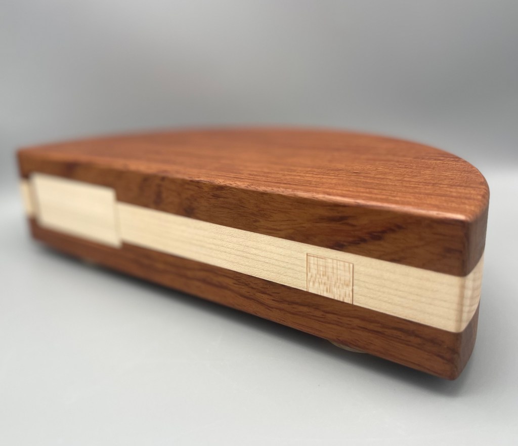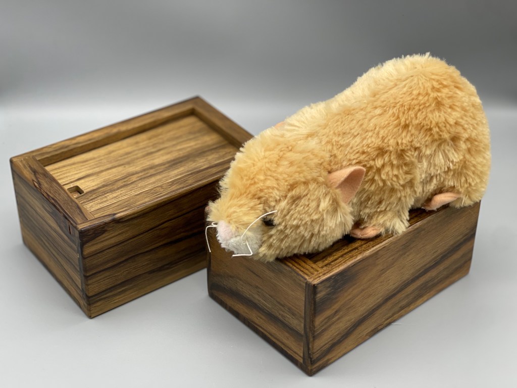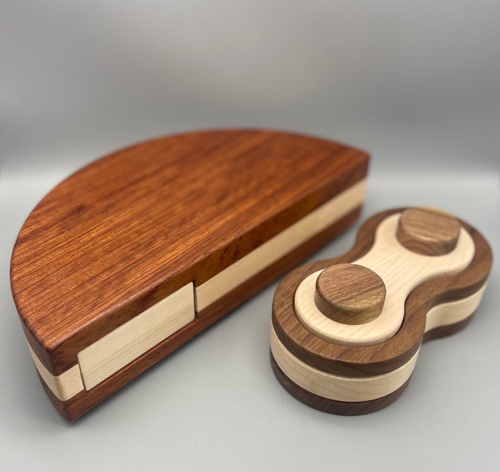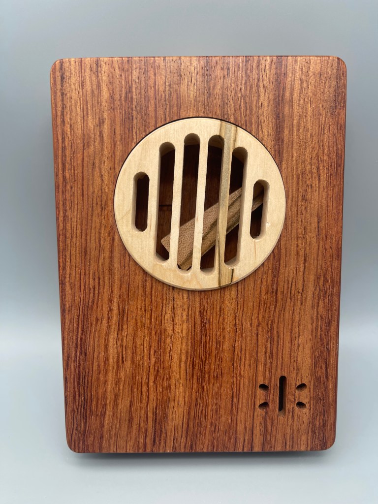 Oleg’s Wardrobe is a beautiful little cabinet with a door (maybe an Armoire?) in a weighty package (close to 2.5 lbs!). Mine is Black Limba and African Mahogany and the final version will be Peruvian Walnut and African Striped Mahogany (sure to be at least as pretty as the one I solved). The goal is to retrieve the Orb of Prosperity, which is hidden somewhere inside the wardrobe. After appreciating the little dagger doorknob, the door opens readily (with a reveal that made me laugh) but upon opening it up, there seemed to be little to work with. A rotating semi-circle on one side, a hole beneath it, and something that might be a button (that doesn’t press) on the bottom of the box. And that’s it (other than the drawers and door)! Shaking it a bit you can hear a bit of rattling… the Orb? Something else?