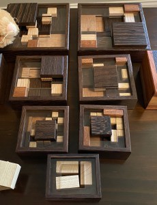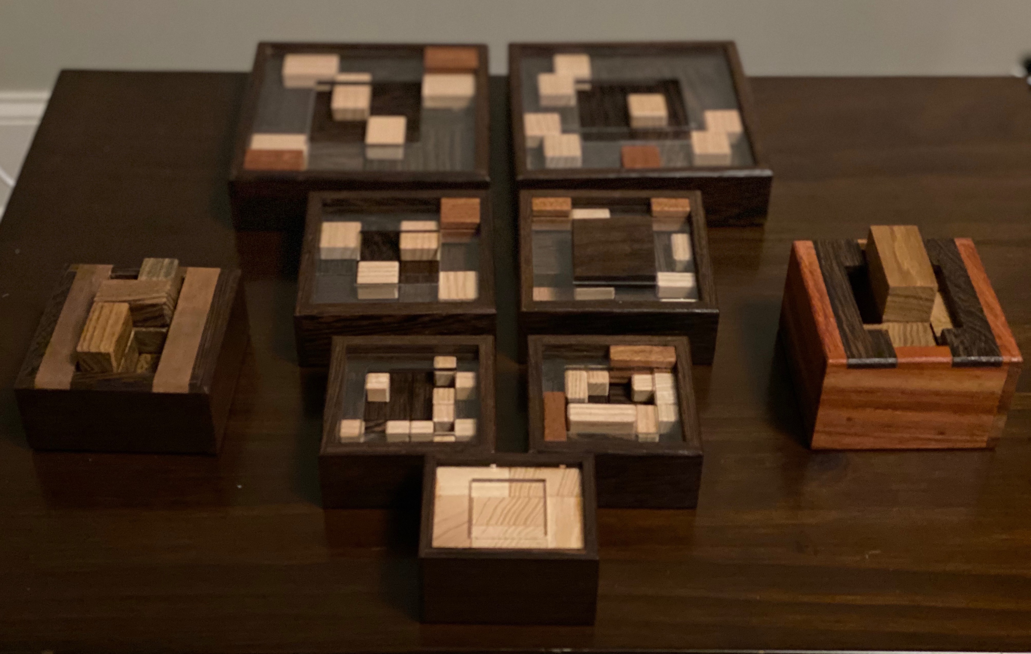The result can be quite tricky and is most definitely fun. I initially got #2 and 4 (knowing as I did that I would almost certainly end up wishing I had just gotten them all – my recent delivery of #1, 5, 7, and 8 shows I was most definitely right in thinking I had been wrong). My first impression was that they are quite attractive looking puzzles: his work is always wonderful looking and these are no exception. Dark wenge boxes with a reddish sappeli for those with blocks attached, which cover one of the two levels and protrude above the acrylic top for half that height. The pieces match the boxes with the same wenge contrasted by light ash blocks atop them. On the bottom of the box he has his logo/initials engraved above the name and # of the puzzle. Interestingly, they range considerably in the square’s dimensions (while all sharing a height of 3.5 cm): 1 & 2 are 7.5 cm, 3-5 are 9.5 cm, 6 is 11.5 cm, and 7 & 8 are 13.5 cm (ranging in price for a reasonable $30 – $50 depending on size). I’m happy to say that Yavuz is designing additional Packs, extending the series to (at least, I believe) 15.