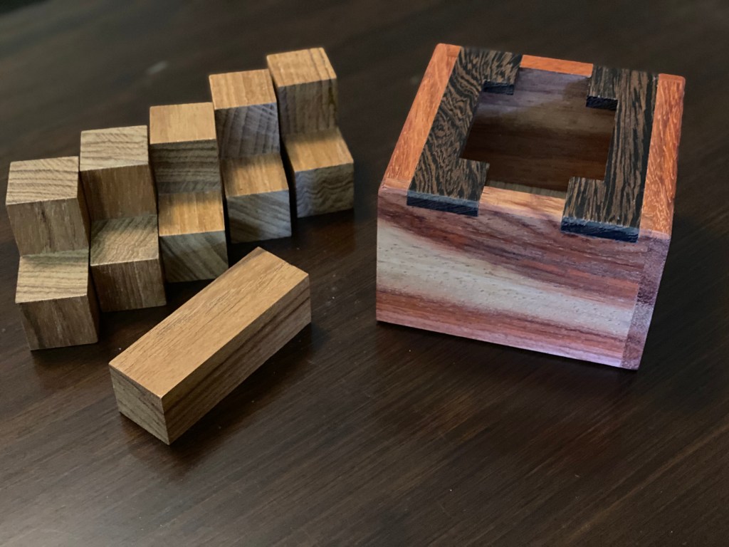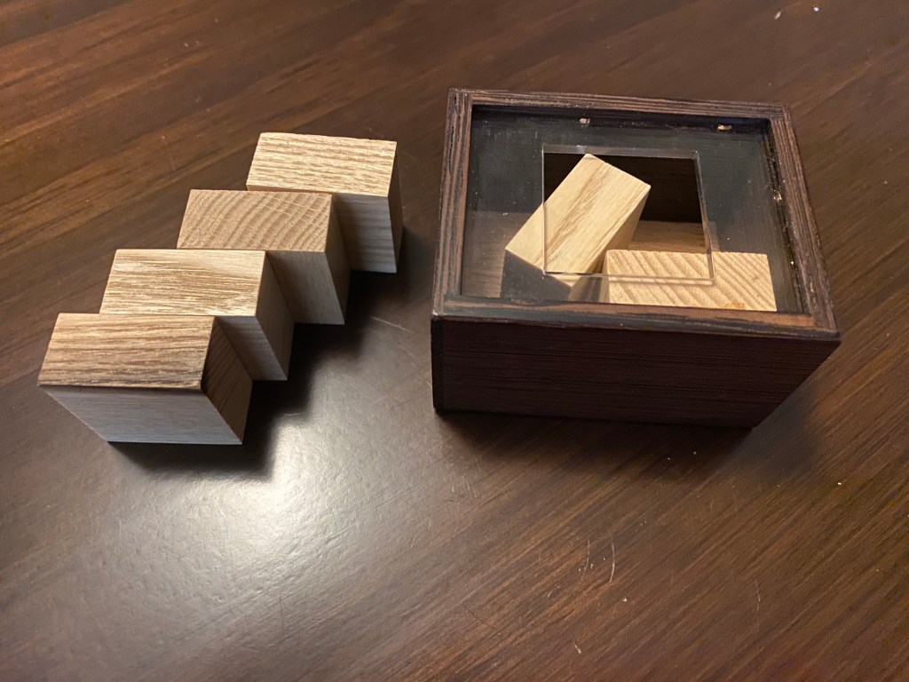 It is a pretty straightforward puzzle: 4 blocks with small metal pins on one side and a slot running down another must fit into a cube with one corner open. This is made much more difficult by the fact that the slots do not run the length of the block; the perfect fit into the cube creates a challenge in fitting them in despite the pins’ best efforts to the contrary.