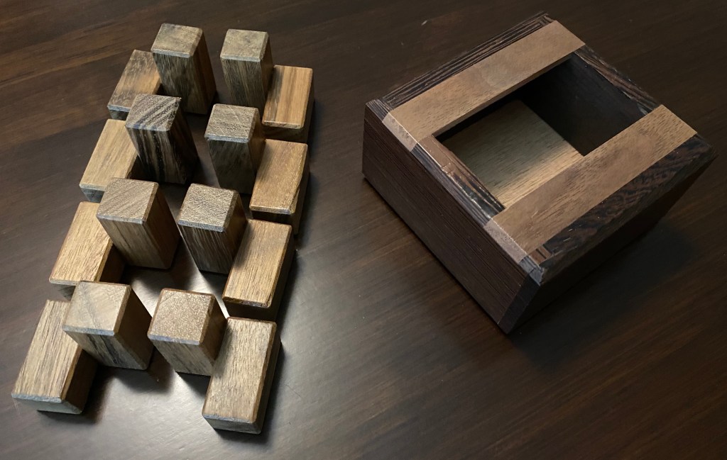 While by no means simple, neither is it an overly difficult puzzle – in my experience, one of his other packing puzzles was more challenge than I could meet (I am admittedly not so great at packing or interlocking puzzles generally – my interest far exceeds my ability when it comes to these types of puzzles).