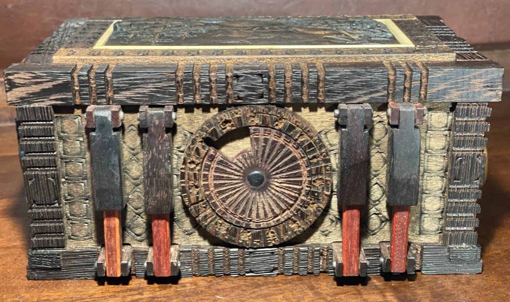 Barasoain again steps up the overall complexity and begins to integrate some SD elements into its mechanisms. The appearance alone makes the added complexity (as compared to Rizal and Barasoain) clear, with multiple sections on the top and bottom that appear as though they may do something, as well as a small protrusion at the top and a hole on the back. If you have solved the previous two RCRs, you may make some relatively quick progress, leading to something that clearly does something else….. only, that something else doesn’t seem to be happening! This puzzle had me confused for longer than I’d care to admit, and was the first of Rex’s puzzles to make me wonder if there was something wrong with it (there wasn’t). Some close and careful observation, combined with a bit of trial & error (and perhaps a bit of that thinking thing), and you should find yourself past this wall, gaining access to the coin. Resetting is straightforward, just reverse the steps and it is ready for someone else (or for you to try again in a year or two when you’ve forgotten how it works….. not that this ever happens to me, of course).