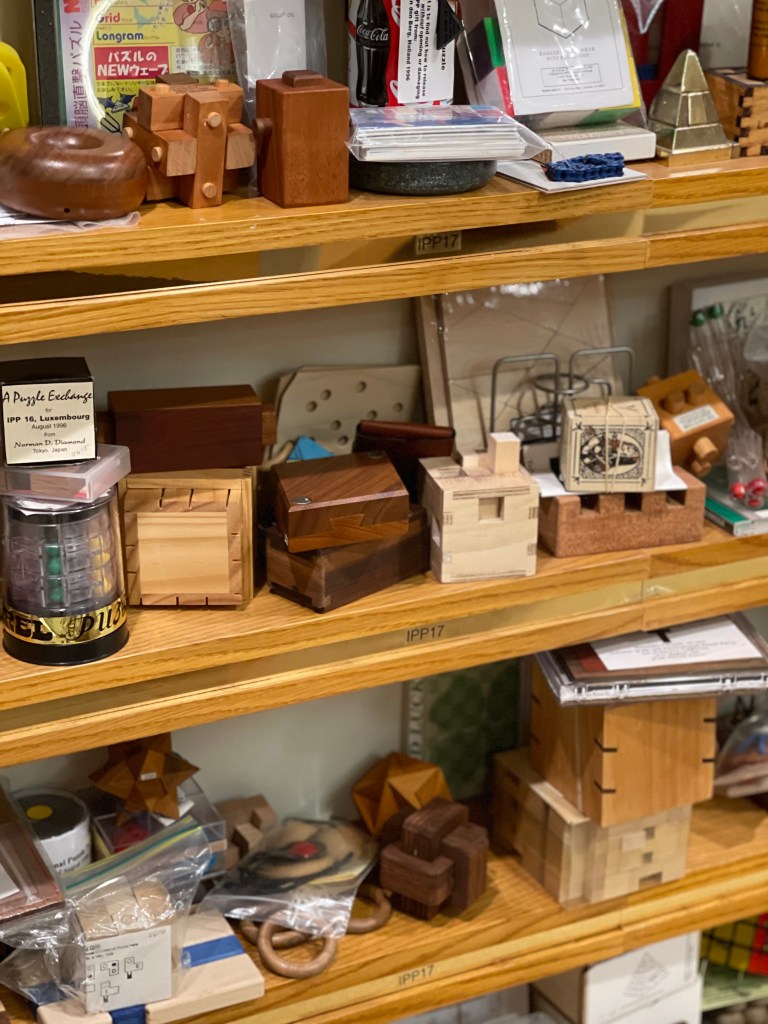 The next day, I got to meet more of the puzzlers who were there for the weekend and got a slower tour of the Museum (I’d seen a bit the night before but the siren song of the box room was too strong to spend much time elsewhere at first). Later that evening, George took me on a full tour of their house; both properties are absolutely filled top to bottom with puzzles, as well as a helluva lot of material and tools for designing and making new ones.